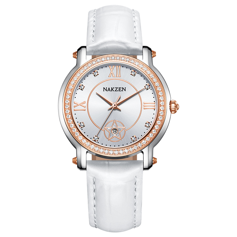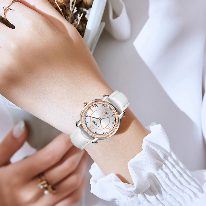 Đồng hồ thời trang với dây da và mặt đính đá với thiết kế sang trọng tinh tế.